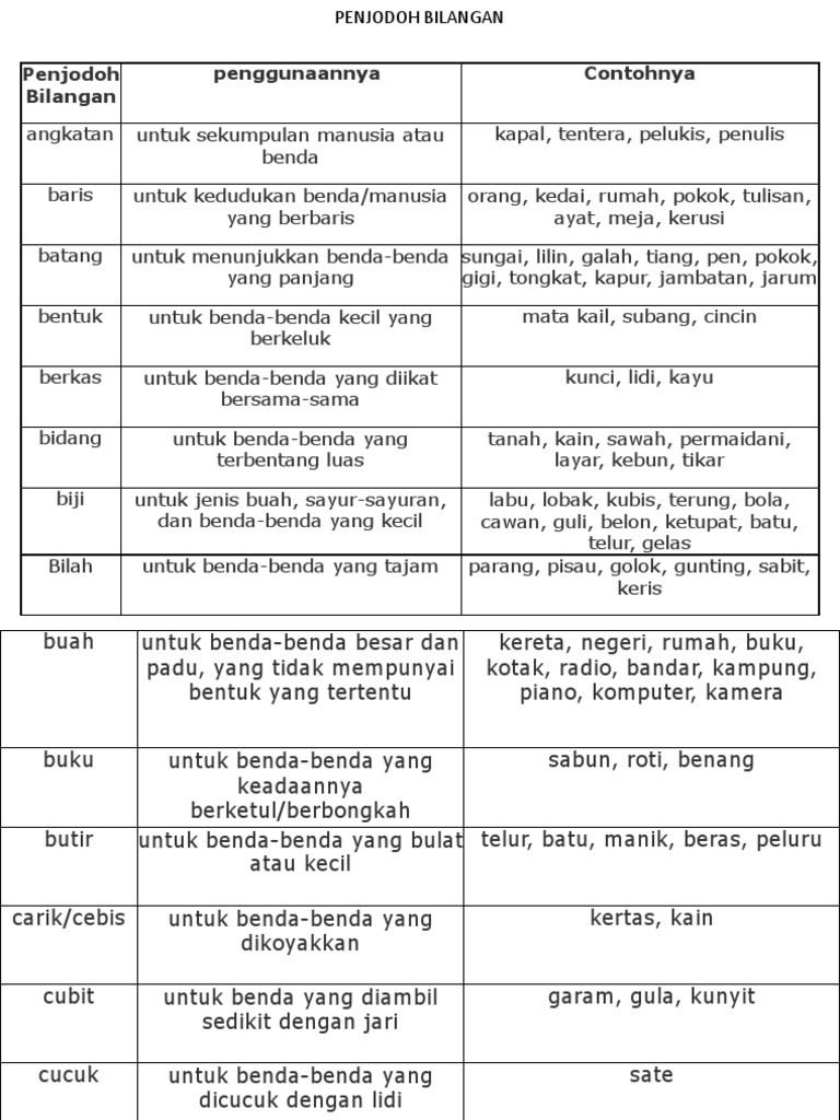 Penjodoh Bilangan Penjodoh Bilangan Digunakan Sebelum Penjodoh Bilangan Penjodoh Bilangan Digunakan Sebelum Pdf Pdf4pro from pdf4pro.com Penjodoh bilangan digunakan untuk menentulkan sesuatu benda mengikut bentuk, rupa, saiz 4. Ikat hiris titik butir puntung untai das laras. 28 pembalak itu menebang a. Kadangkala kata bilangan disertai penjodoh bilangan seperti batang, buah, ekor, orang, dan sebagainya. Penjodoh bilangan ialah kata nama yang menjadi pasangan kepada kata bilangan bagi. Aplikasi ini adalah untuk pelajar ukm belajar penjodoh bilangan dalam bahasa cina dengan lebih mudah. Penjodoh bilangan tatabahasa bahasa malaysia/ bahasa melayu. Penjodoh bilangan digunakan sebelum sesuatu kata atau nama yang menunjukkan jumlah atau bilangan.
