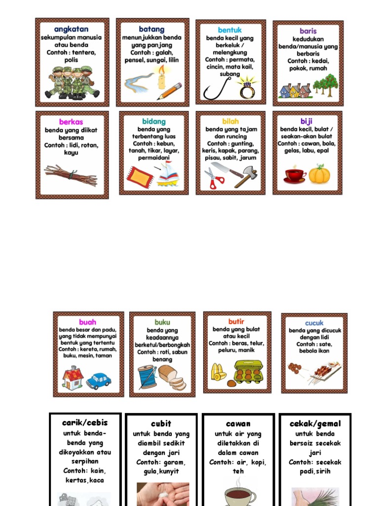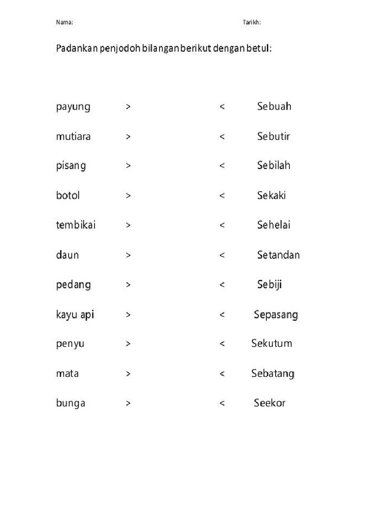 Senarai penjodoh bilangan, penggunaannya, dan contohnya adalah seperti yang berikut: Penjodoh bilangan interactive activity for tahun 1. * senarai penjodoh bilangan berikut merupakan bahan senarai penjodoh bilangan bm. Dalam sesuatu bahasa yang ada penjodoh bilangan, sesuatu kata nama boleh disertakan penjodoh bilangan. Penjodoh bilangan yang betul ialah. Jarum, surat, pistol, meriam, senapang, rebung. Penjodoh bilangan tatabahasa bahasa malaysia/ bahasa melayu. Naskah sisir jambak cucuk rangkap lembar tangkai bidang. Pilih jawapan yang paling sesuai untuk mengisi tempat kosong dalam ayatayat berikut. 2.penjodoh bilangan digunakan untuk 5. Penjodoh bilangan ialah kata yang digunakan untuk membilang unit benda, orang, haiwan, tempat dan sebagainya. Penjodoh bilangan digunakan untuk menentulkan sesuatu benda mengikut bentuk, rupa, saiz 4. Sebatang jarum bukan sebilah atau sepucuk.