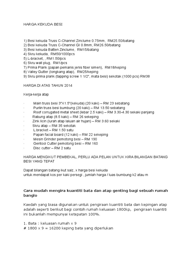 Membekal roof trusses kekuda besi bumbung rumah termasuk penghantaran ke seluruh malaysia harga jimat dan murah dari hardware besi ketebalan dari 0.73mm ke 1.0mm spec jkr besi biru atau putih harga serendah rm19 ke atas pembayaran di site diterima whatsap 0102578005 untuk. Dengan keterangan harga besi beton, harga besi, harga besi bangunan, harga besi cor, harga besi 10, harga besi 8, harga besi siku, harga besi beton merupakan komponen wajib dalam penyokong kekuatan pondasi rumah anda. Kekuda besi (light weight roof trusses) diseluruh semenanjung dengan harga terendah mengikut kemampuan tuan rumah dan harga yang kami memerima pemasangan kekuda besi di kediaman teres, semi d, banglo 2 tingkat, porch kereta. Pagar besi minimalis sangat cocok untuk konsep rumah anda yang simpel namun tetap elegan. Besi plat yaitu bahan baku dalam pembuatan beraneka ragam mesin dan kebutuhan industri lainya. Pagar besi yang satu ini memiliki ukiran yang khas, cocok untuk rumah bergaya klasik yang mewah. Setiap pemilik rumah mesti mahukan yang terbaik untuk rumah mereka dan pemilihan kekuda sangatlah penting. Rumah banglo kaedah yang biasa digunakan untuk pengiraan kuantiti bata dan kepingan atap adalah seperti berikut bagi contoh rumah keluasan 1800kp, pengiraan kuantiti ini. Karena itulah terus dikembangkan inovasi material bangunan yang bisa memenuhi kebutuhan tersebut. Lalu apa saja yang perlu anda perhatikan saat membangun rumah tahan gempa tersebut? Seperti pembuatan kendaraan beroda empat, kapal dan beraneka tipe alat harga plat besi. Selain model minimalis, terdapat juga pagar besi tempa harga pagar rumah minimalis tergantung dari jenis yang dipilih. .bilangan batang ikut saiz, x harga besi kekuda untuk mendapat kos per kaki persegi , jumlah harga / luas bumbung k2 atau m.