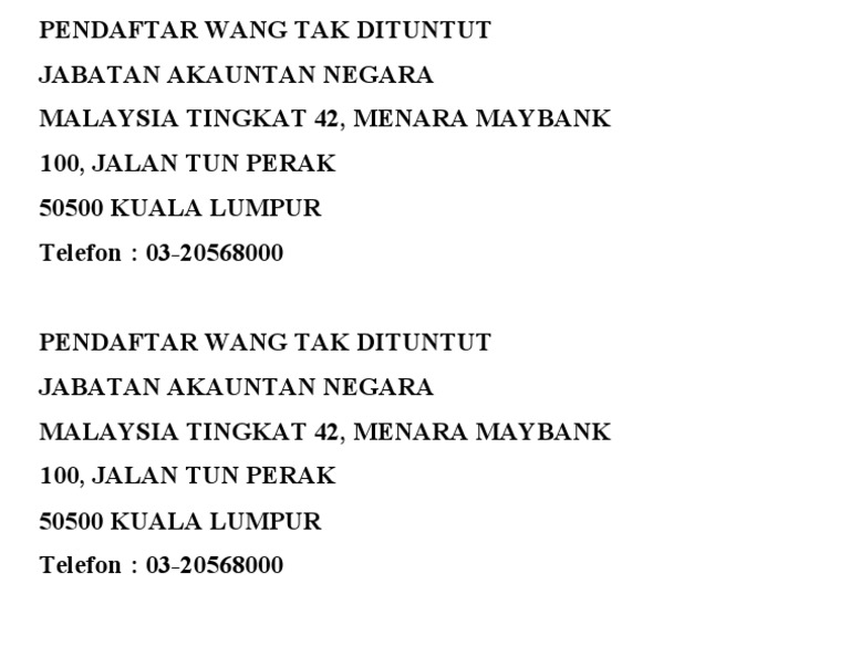 Jabatan bendahari, universiti kebangsaan malaysia, 43600 ukm bangi, selangor darul ehsan, malaysia telefon: Welcome to the fast link of the accountant general's department of malaysia official portal. Jabatan akauntan negara malaysia (janm) menara maybank, kuala lumpur mula dihadiiri dengan orang ramai sehingga sesak ekoran kisah yang semakan wang tak dituntut (wtd) boleh dibuat di bahagian wtd, jabatan akauntan negara. Jabatan akauntan negara malaysia @ pahang kuantan, pahang, malaisia jabatan akauntan negara malaysia @ pahang lahtiolekuajad jabatan akauntan negara malaysia @ pahang aadress jabatan akauntan negara malaysia @ pahang telefon määratlemata. Untuk maklumat lanjut, sila hubungi jabatan akauntan negara malaysia, bahagian pengurusan wang tidak dituntut melalui saluran berikut alamat ibu pejabat pendaftar bahagian pengurusan wang tak dituntut tingkat 42, menara maybank 100, jalan tun perak 50050 kuala lumpur tel no.